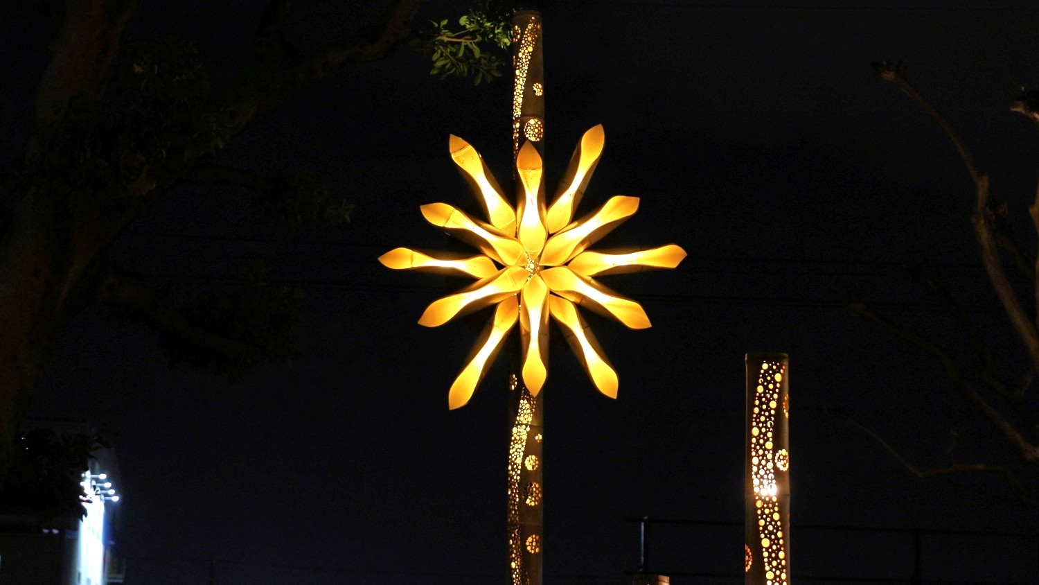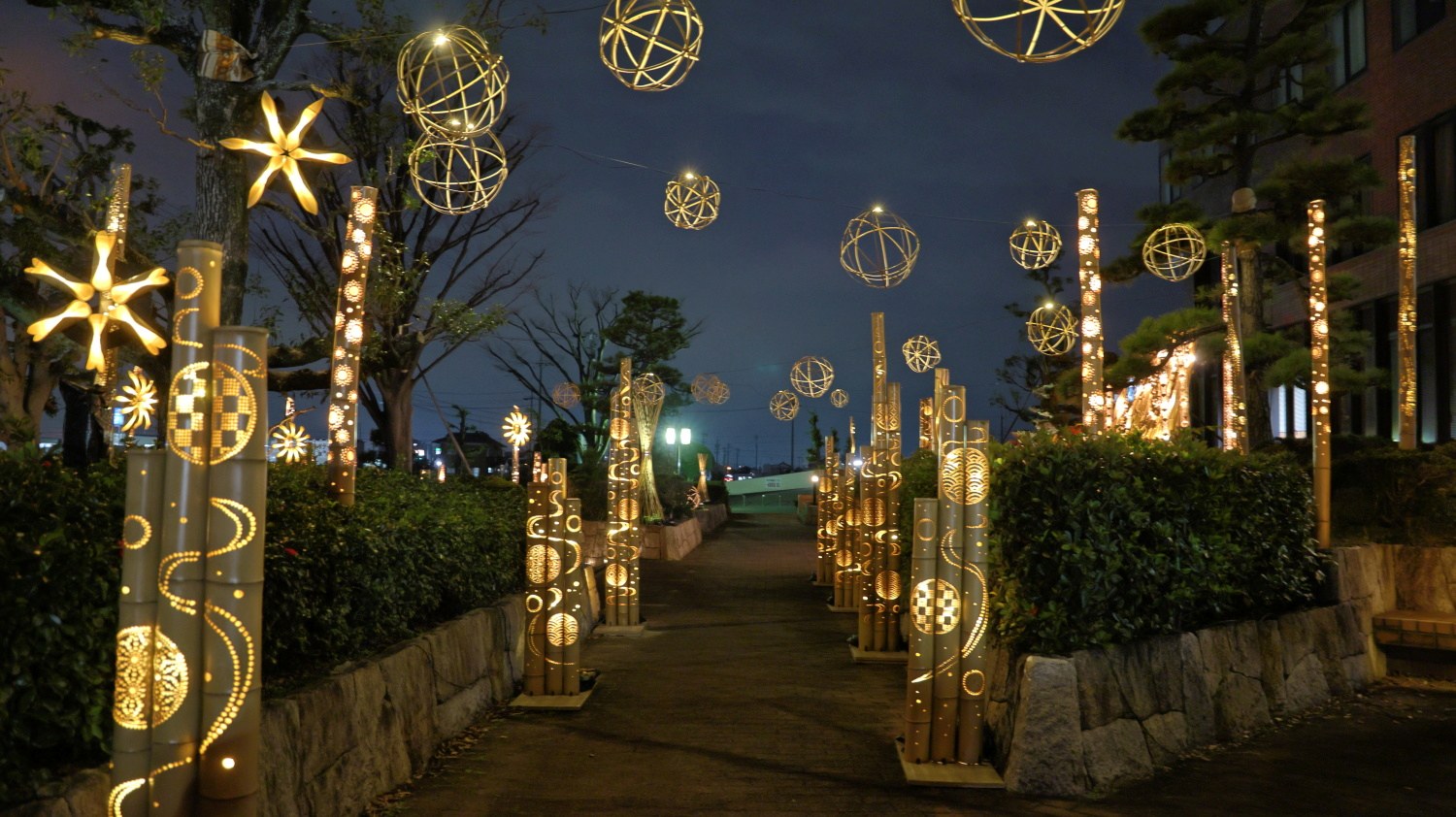 | 撮影日:2025/12/16 PM6時頃 天気:晴れ 愛知県飛島村に静かに優しい灯が出現、本年度もイルミネーション竹あかり「Tobishima Lights」が実施されてます。本年度は役場南側通路(メイン会場)に設置されてます。又、サブ会場では、中央公民館ホールロビーに希莉光あかりや役場正面玄関付近に美濃和紙あかり、傘蛍等の展示されてます。 撮影場所→地図 |