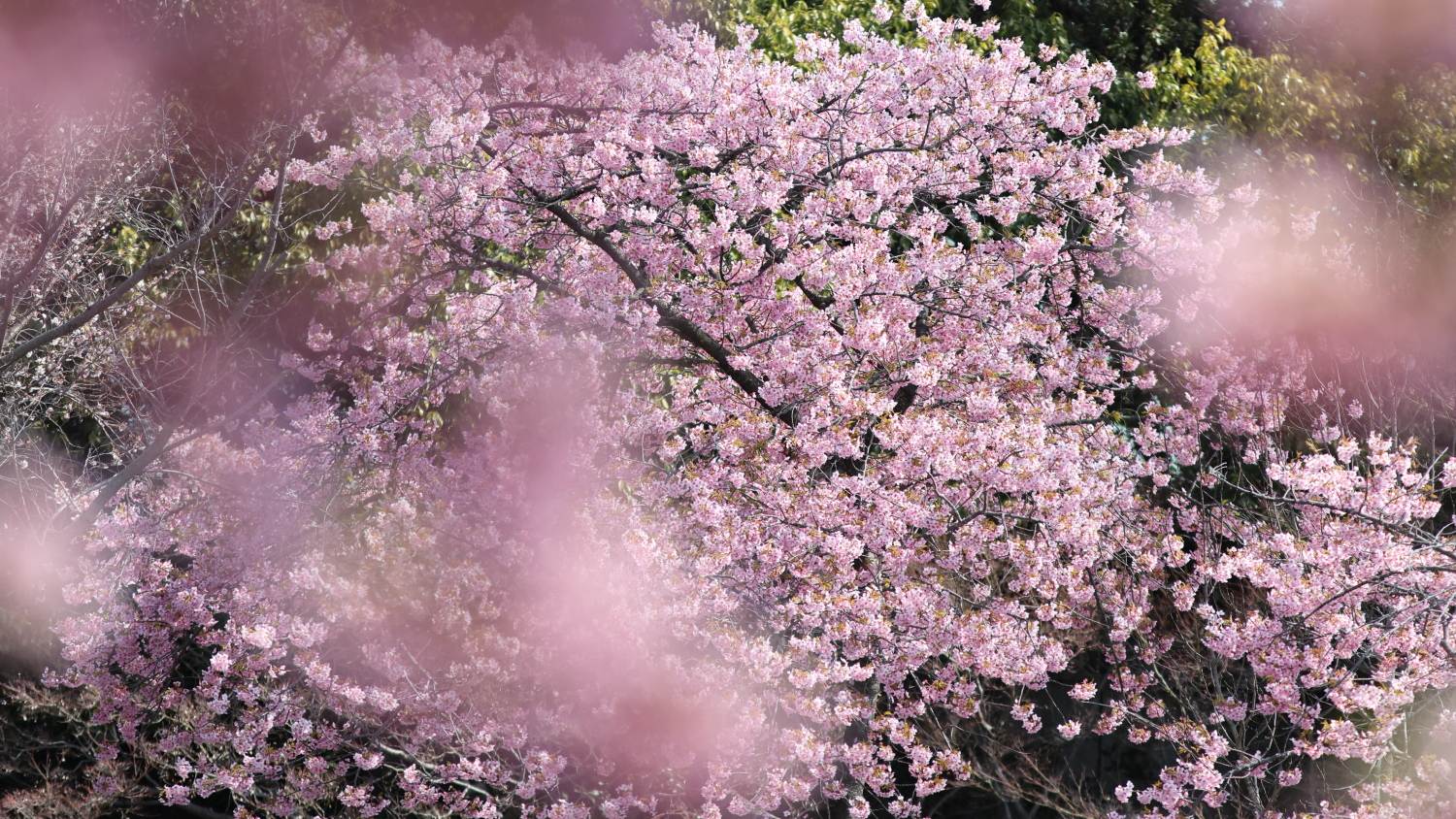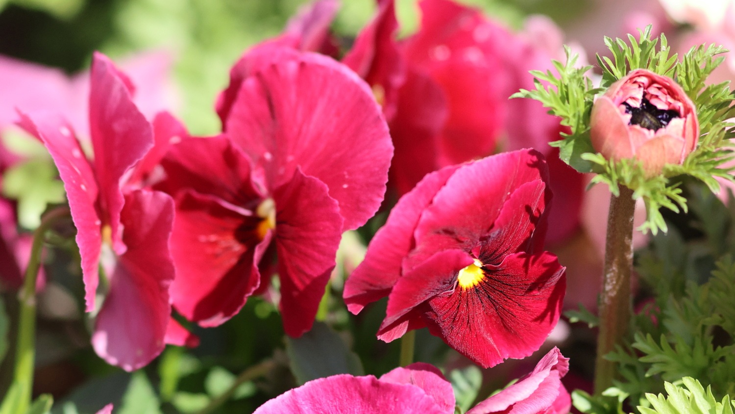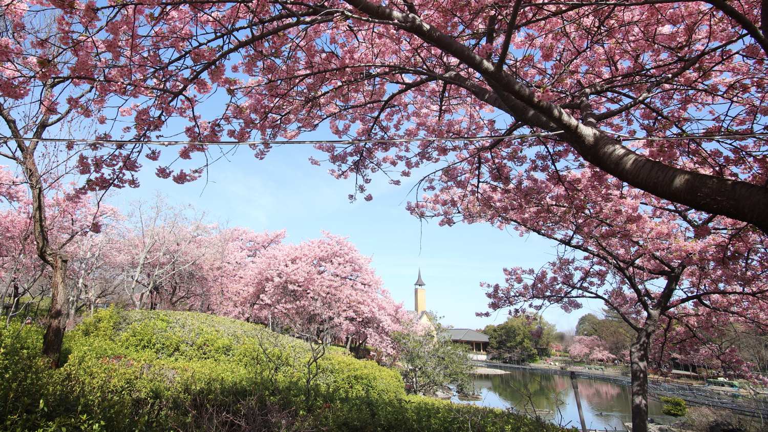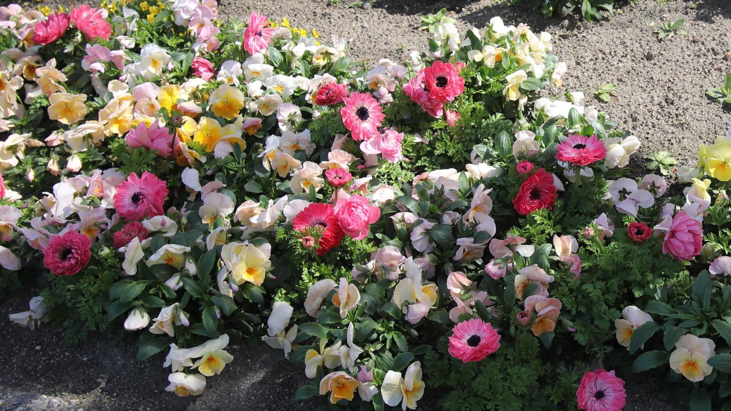 なばなの里の大河周りの河津桜美しさは継続中!ベゴニアガーデン前の河津桜とマンサクが咲き競っています。その他、アネモネ、パンジー、シロタエギクも奇麗でした(^^♪